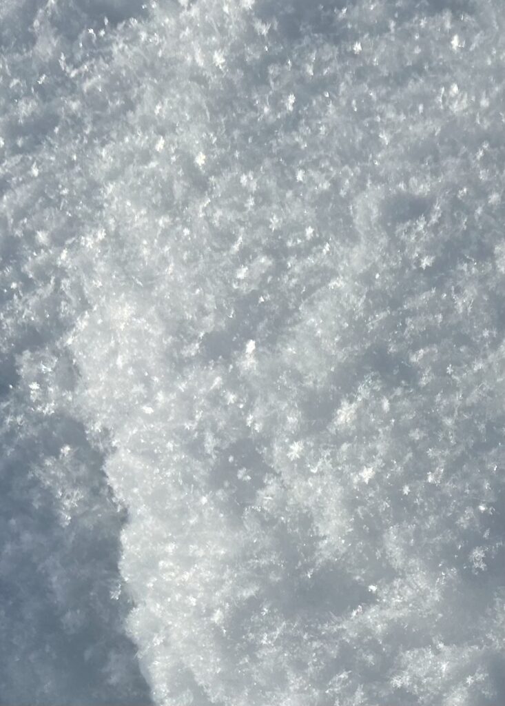 陽の光を反射してチラチラと光る雪原には、六角形の結晶がちょうど良くこちらを向いてくれている